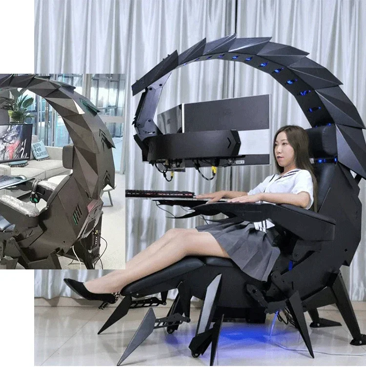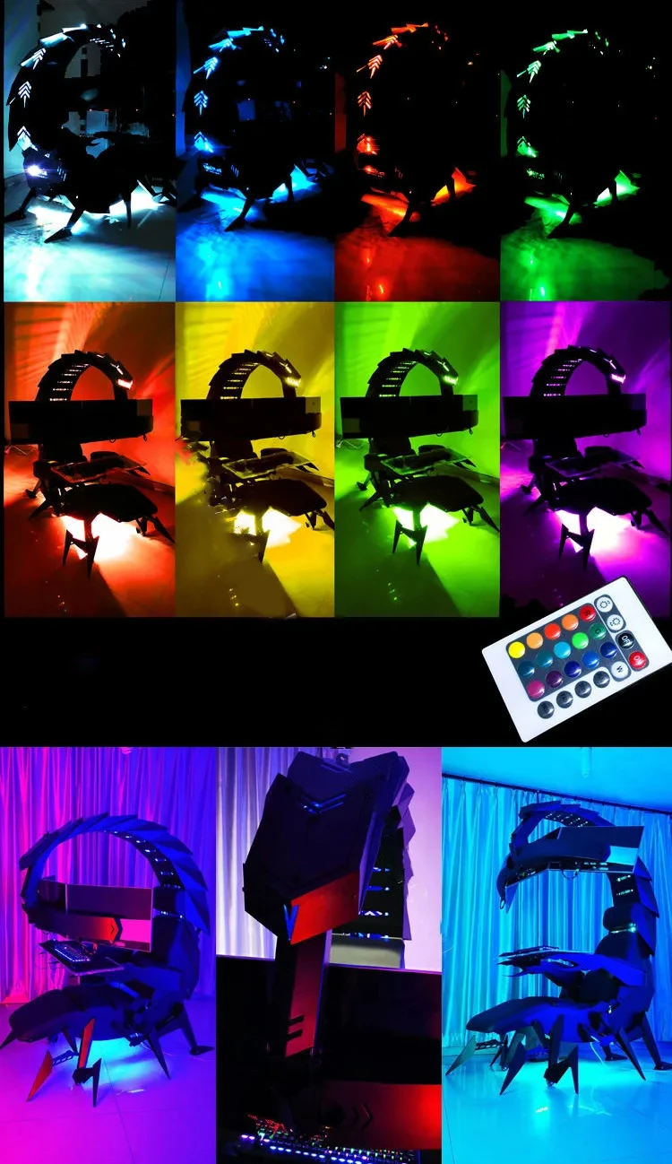 1. Super luxury and comfort Equipped with high-density styling sponge and high-end PU leather, it is super comfortable and brings you multi anglecomfortableexperience. 2. Unprecedented high-end settings, E-sports black Technology The super large keyboard bracket can be extended by 87 * 34cm, and the adjustable range is up to 20cm The whole cockpit is electrically controlled and equipped with LED lighting. 3. It is suitable for single screen, two screen, three screen and five screen of various display suspension systems, withperfectmatching of various sizes. 4. Armrest with storage box and cup holder 5. Hand made high carbon steel, scorpion is made of strong high carbon steel frame, all frames have high resistance powdercoating. 6. Hidden wiring, more safe and reliable 7. Large capacity internal space is convenient for your transformation, installation, connection of MAC, PC, PS, Xbox game console, etc. 8. Full control panel: adjust the most comfortable posture at any time, and feel the charm of ergonomics in all directions. 9. Working voltage: 110-240V ~ 50 / 60Hz, suitable for global standard, can be added according to customer demand. 10. Display control: adjustable display control, multi-directional adjustment, tilt / height. LED work lights. 11. RGB decorative LED, through the remote control can be 16 color adjustment.